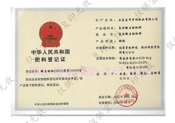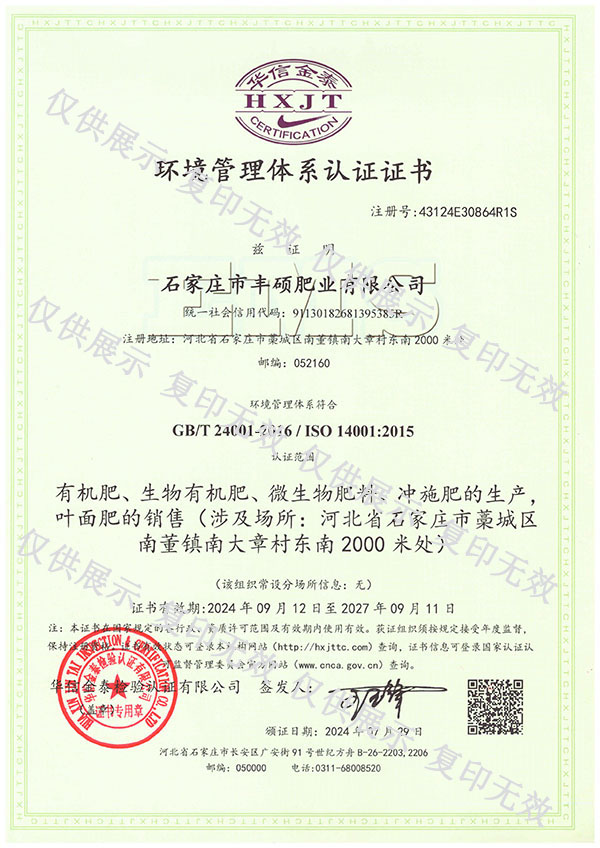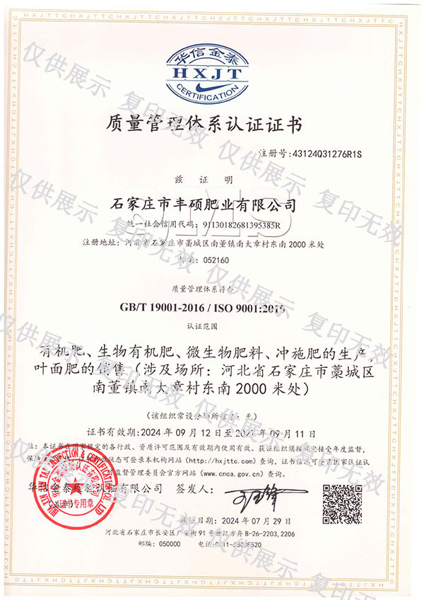 石家莊市豐碩肥業(yè)有限公司是一家集新型肥料的研發(fā)、制造、營銷、服務(wù)于一體的高新技術(shù)企業(yè),公司自2008年創(chuàng)辦以來,一直致力于新型肥料的技術(shù)研發(fā)和市場推廣。公司組建了豐碩新型肥料研究中心(院士專家企業(yè)工作站),自主知識(shí)產(chǎn)權(quán)研發(fā)團(tuán)隊(duì)專業(yè)科研人員20余人,獲得了多項(xiàng)肥料國家發(fā)明專利。公司目前已擁有發(fā)酵類有機(jī)肥、微生物菌劑、生物有機(jī)肥、土壤調(diào)理劑、大量元素水溶肥、含腐植酸肥料、含氨基酸肥料、中微量元素肥料等8大品類,“金維克”、“豐碩沃農(nóng)”等2大自有品牌,擁有20多個(gè)暢銷品種。目前,我公司已經(jīng)通過了“ISO9001 質(zhì)量管理體系認(rèn)證”、“ISO14001 環(huán)境管理體系認(rèn)證”、“OHSAS18001 職業(yè)健康管理體系認(rèn)證”。...